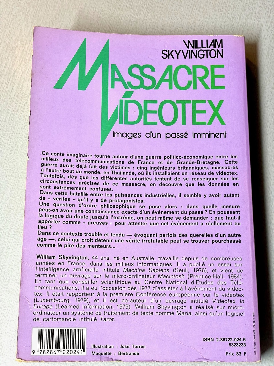 Ecrit en 1984, pas sûr que je le lise au vu de son intérêt littéraire et de mon retard dans mes lectures, mais ça reste un beau témoin de la période dorée de la télématique française.
