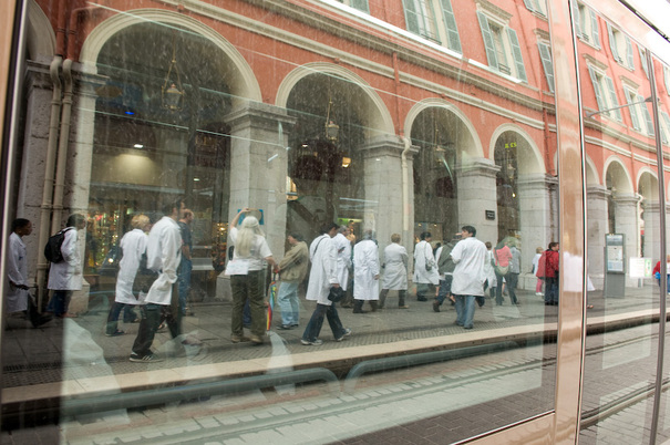 Partis de la place Masséna, nous sommes remontés le long de Jean-Medecin pour rencontrer la population, pour finir à la fac des sciences, où nous avons pu interpeller le président d’Université sur la situation de crise que vivent les EPST, et la recherche française. Malgré plusieurs différences de point de vue sur la réalité de ce qui se tramait, sur les marges de manoeuvre (n’oublions pas que le Président de l’UNS est un pro-LRU) et sur l’articulation entre Université/EPST, il s’est engagé à soutenir des points revendicatifs précis du mouvement, mais pas le mouvement lui même.