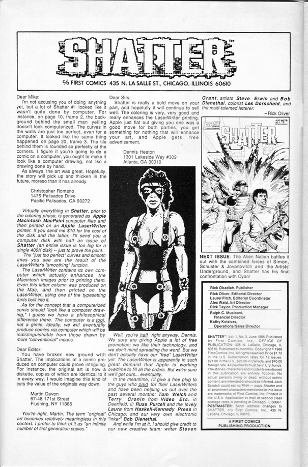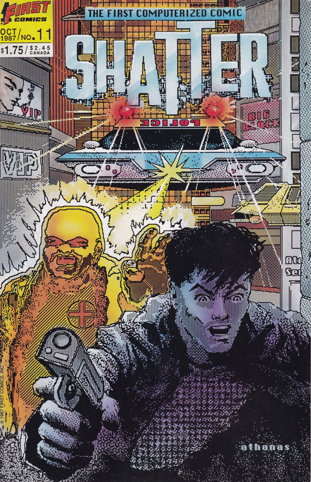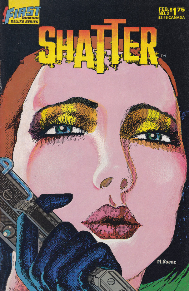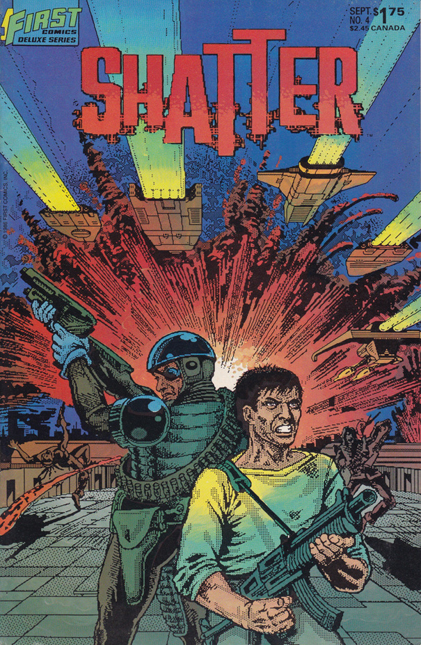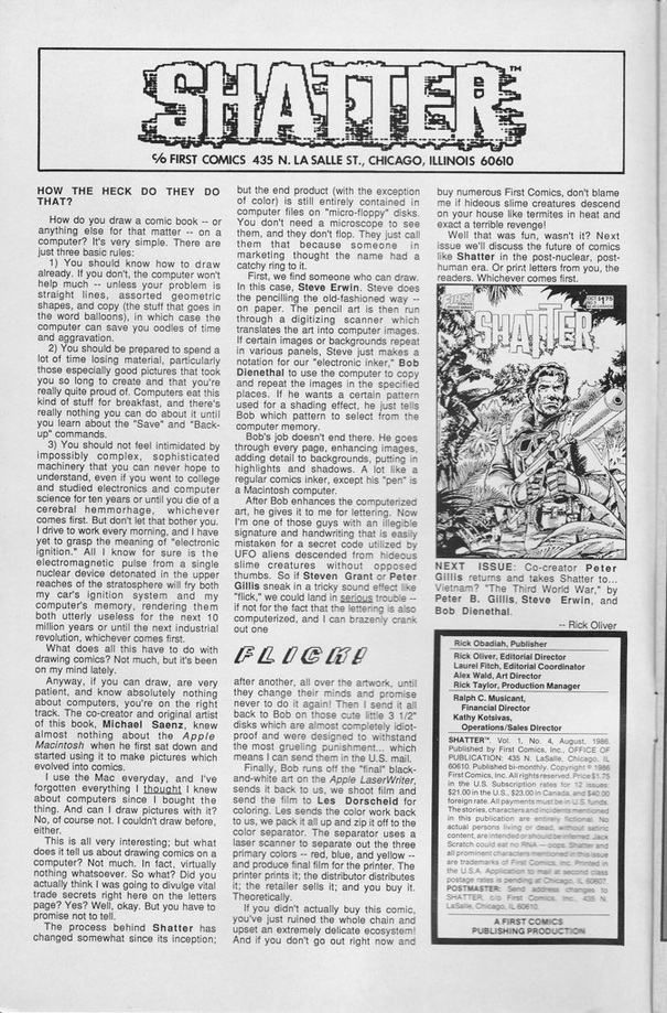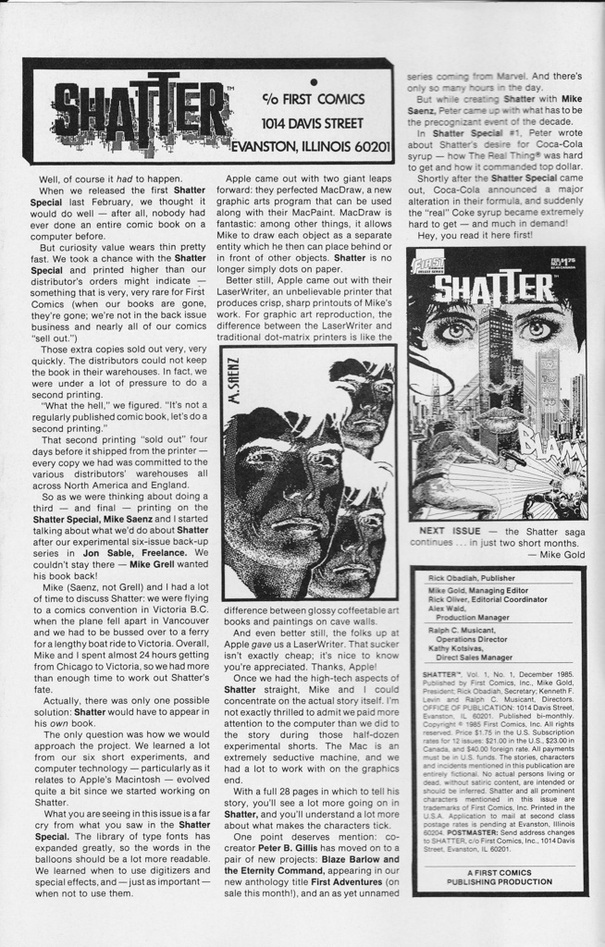 Avec le départ de Saenz, First Comic embauche une nouvelle équipe pour travailler sur Shatter qui prend une nouvelle direction (lire l’édito du 4e numéro) : les dessins sont d’abord réalisés de façon traditionnelle, puis repris sur ordinateur, imprimés sur LaserWriter, transférés sur film et enfin encrés à la main.