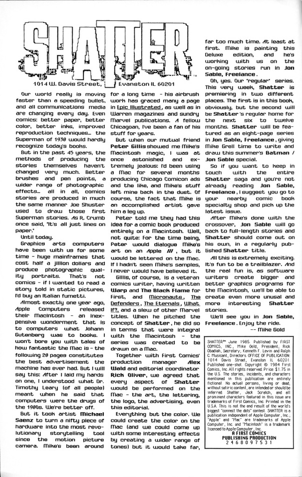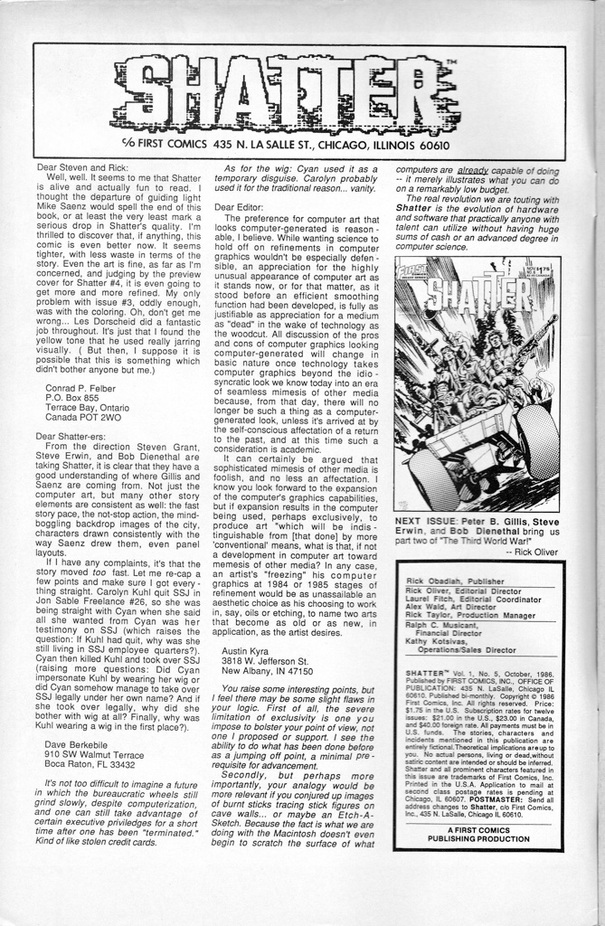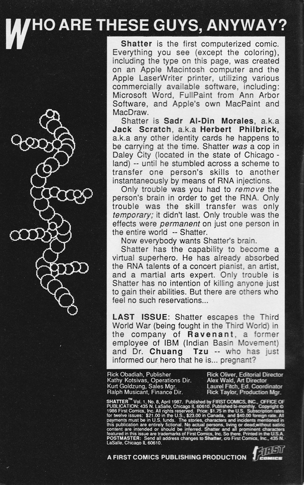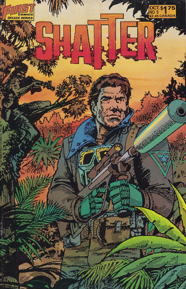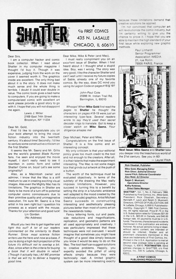Avec le départ de Saenz, First Comic embauche une nouvelle équipe pour travailler sur Shatter qui prend une nouvelle direction (lire l’édito du 4e numéro) : les dessins sont d’abord réalisés de façon traditionnelle, puis repris sur ordinateur, imprimés sur LaserWriter, transférés sur film et enfin encrés à la main.