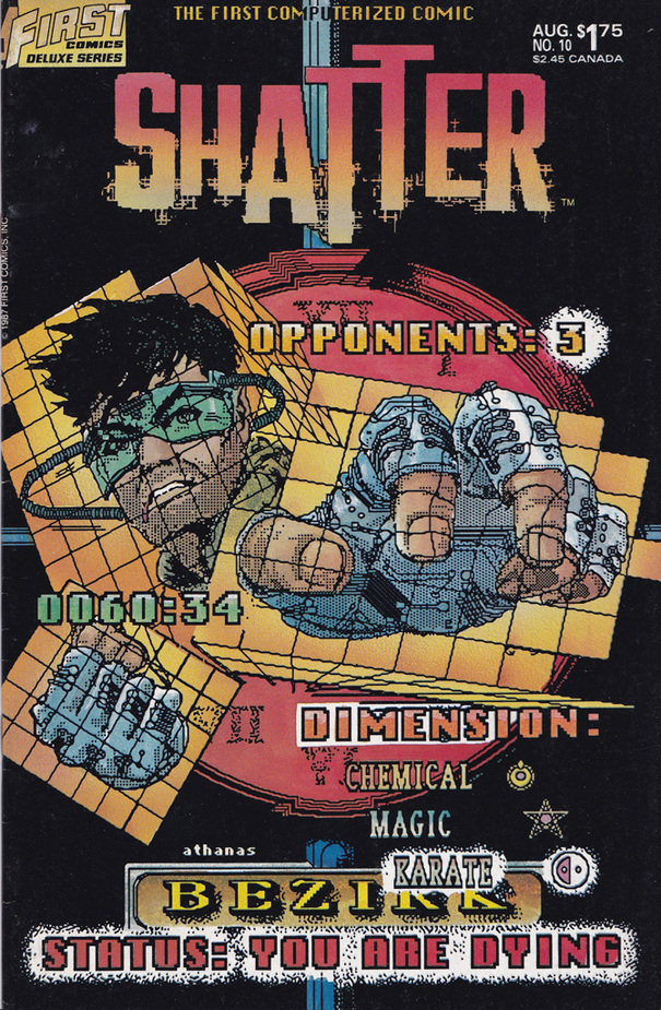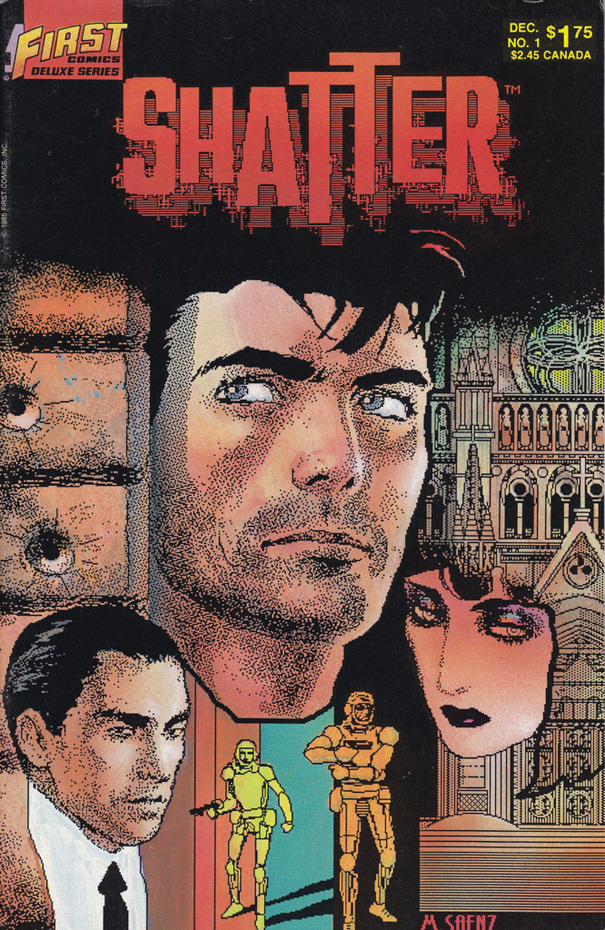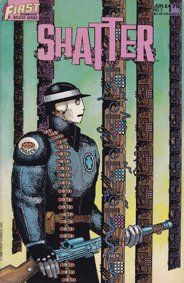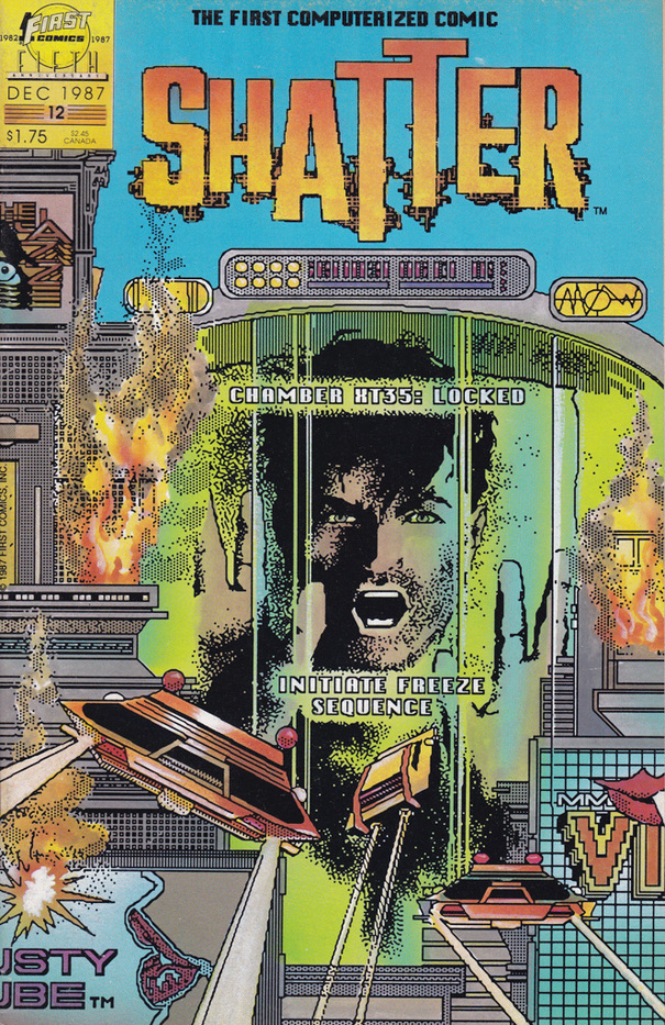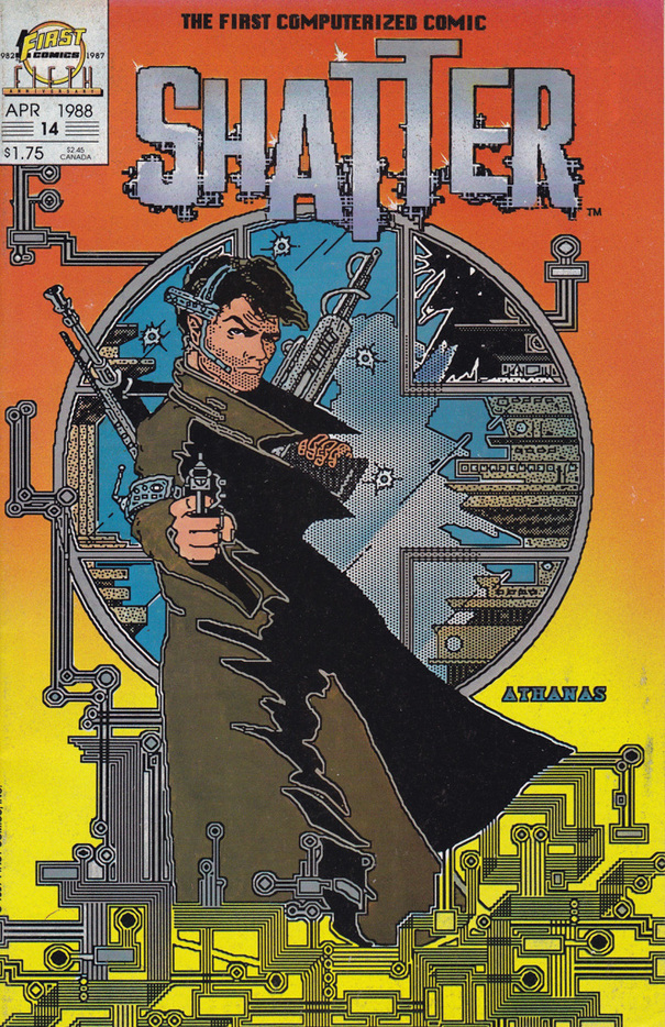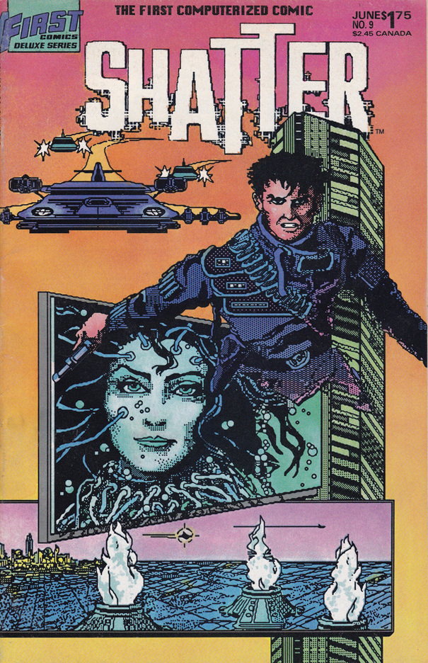 Oublié avec le temps, Shatter est pourtant la première BD (Comic) dessinée entièrement sur ordinateur et devrait à ce titre être plus (re)connu des amateurs. Elle a été créée par Peter B. Gillis (scénariste) et Mike Saenz (dessinateur). Elle s’étale sur 14 numéros de 1985 à 1988